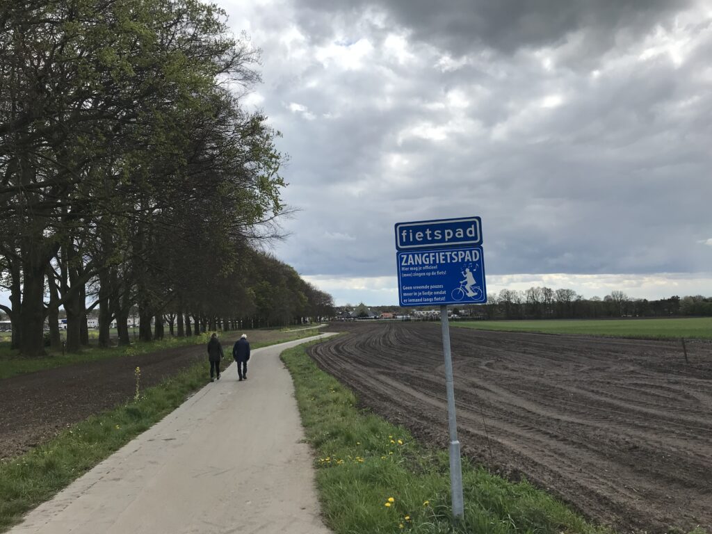 ‘Als je daar nog oog voor hebt, dan zit het wel goed!’ De man is 75 jaar, en draagt een zwartleren hoed. Hij spreekt me moed in, nadat ik hem had gewezen op het eigenaardige bord dat het ‘Zangfietspad’ aankondigt, nabij station Holten.